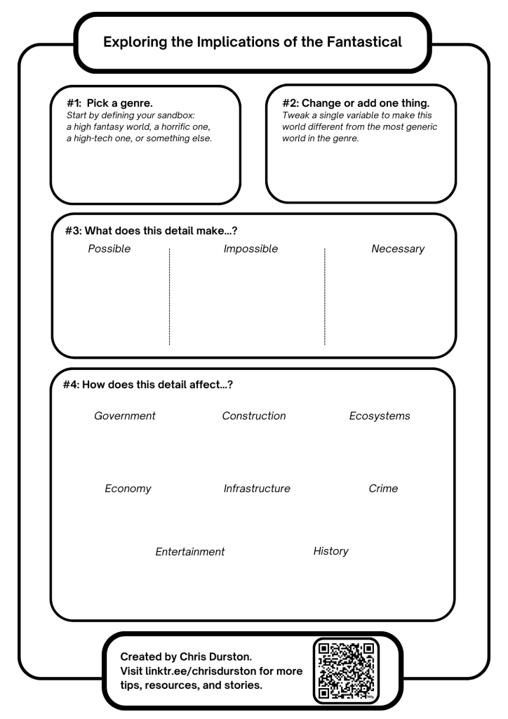 You can probably tell that possible, impossible, and necessary can easily yield the same or similar thoughts, but I still think it’s useful to think about all three so you ensure you don’t miss something interesting. The idea is to spin off from this new element to both widen and constrain things in your world, creating coherent settings that fit together logically.